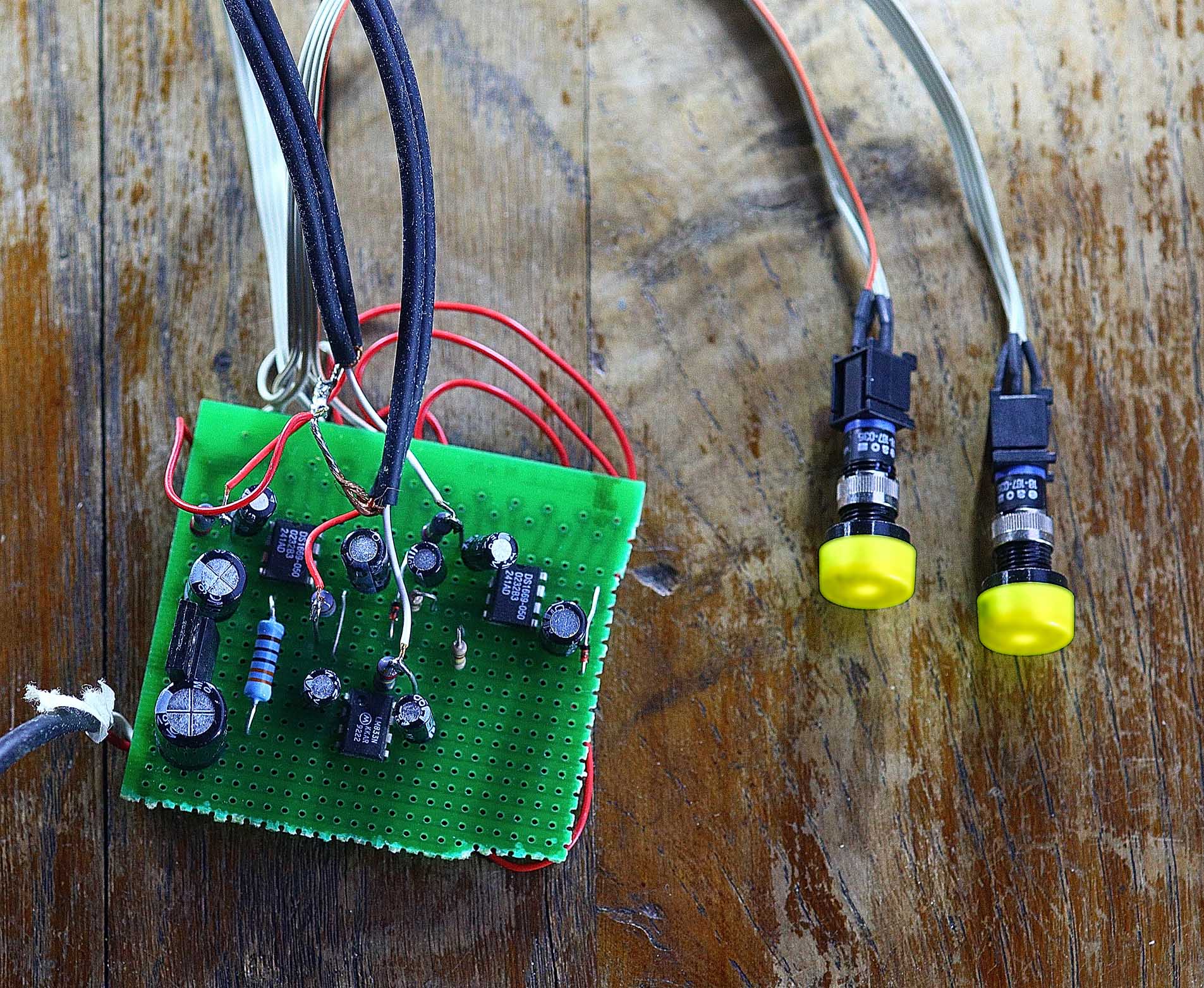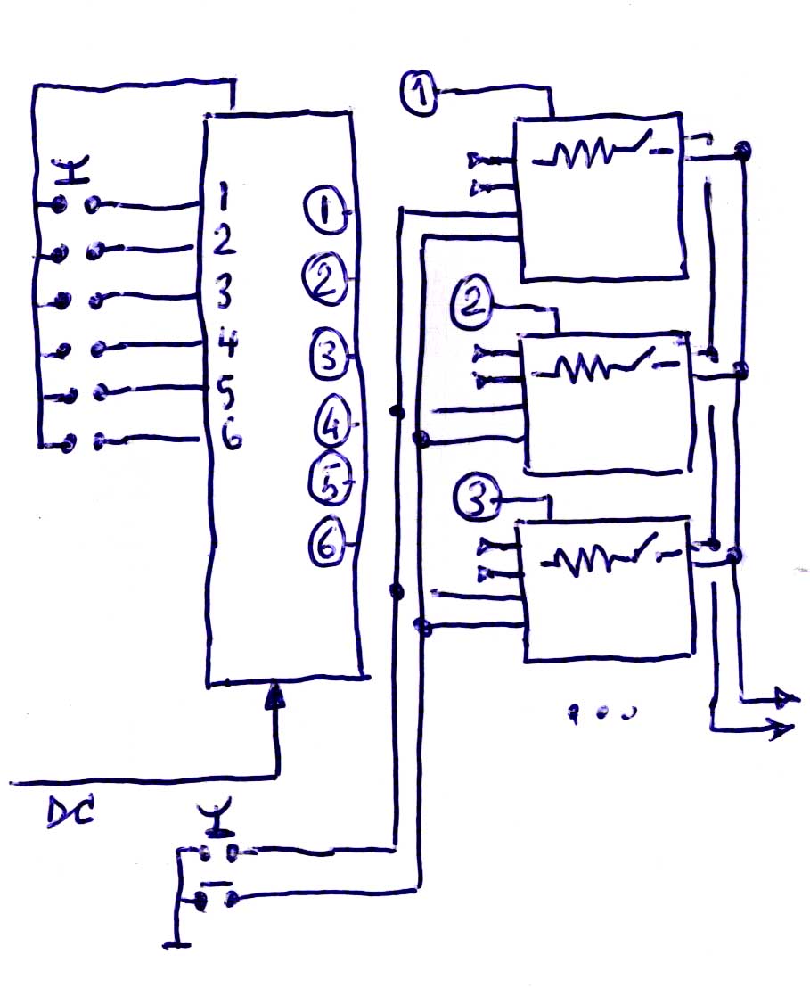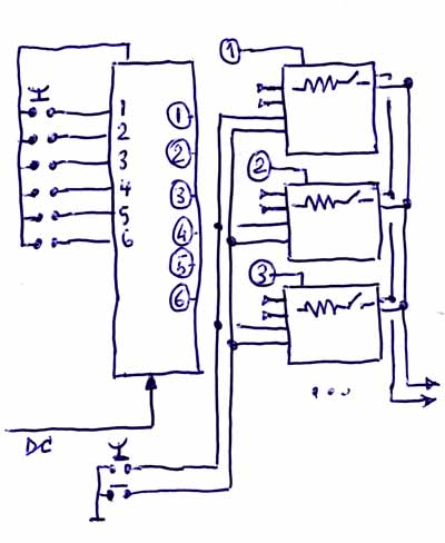 Voor de selectie gebruik in een CMOS 40174 (hex data type flip flop) die het indrukken van een knop opslaat. De uitgang ("1" als geselecteerd) gaat naar de betreffende volume- en stuurprint.
