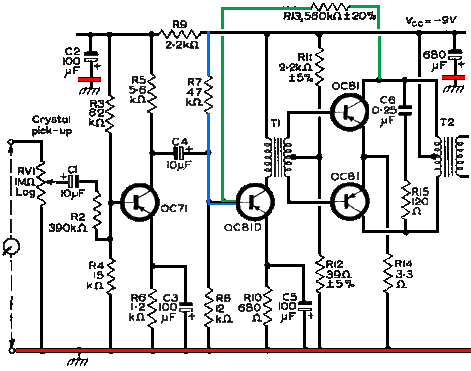 De stuurtrap geeft een vervorming van het signaal en is ook gevoelig voor de rimpel op de wisselspanning. De tegenkoppeling werkt op de twee laatste trappen, daar waar de vervorming het meest aanwezig is. De tegenkoppeling is de groene lijn, de voorwaartse regeling de blauwe lijn. De rimpel wordt via deze weerstand naar de basis van de transistor gestuurd. Deze transistor die asymmetrisch werkt is het meest gevoelig voor een rimpel op de voedingsspanning. De transistor is een OC81D (die geen verbeterde versie is van de OC81: 150mW dissipatie, 16V voedingsspanning, 10mA en 20× stroomversterking).