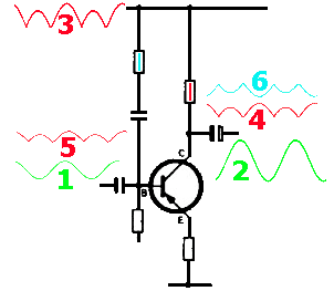 Maar we hebben ook een rimpel op de voedingsspanning, dat is het signaal 3 rood. Dit signaal kan men terugvinden op de uitgang, weliswaar met een verminderde amplitude, maar goed hoorbaar als een 100Hz brom. De storing komt op de uitgang terecht via de collectorweerstand (aangeduid met de rode stip).