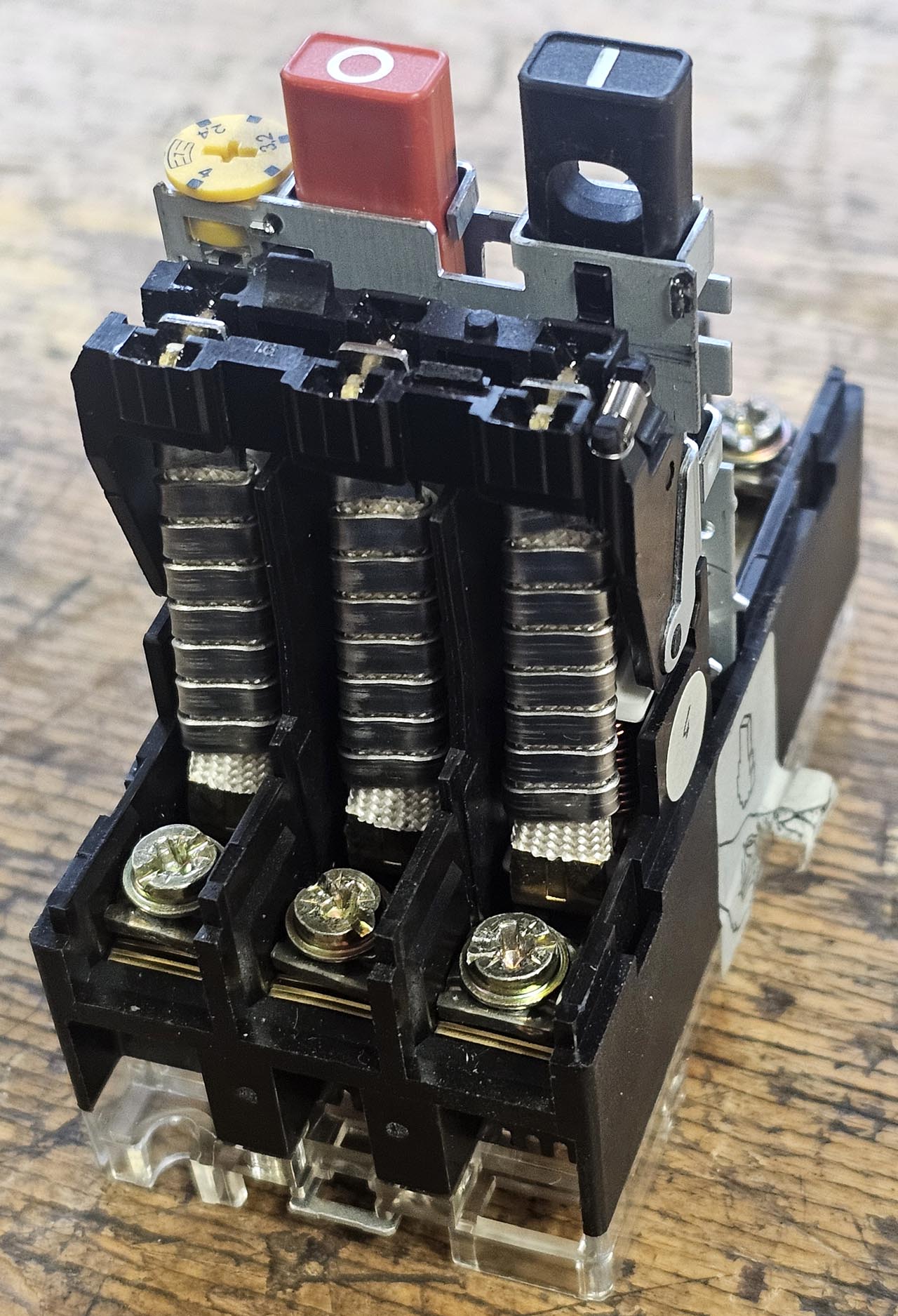De maximale stroom wordt éénmaal ingesteld (hier tussen 10 en 16A en tussen 2.4 eb 4A in de tweede schakelaar). Indien het starten te moeizaam gebeurt en de maximale stroom gedurende meerdere seconden overschreden wordt, dan werkt de thermische zekering. Dit is ook het geval als de motor lange tijd overbelast wordt. De verwarming van de motor komt overeen met de verwarming van het bi-metaal. De motor zelf moet eigenlijk geen thermische zekering meer hebben, want die zit in de motorschakelaar. De stroom door de motor loopt ook door de drie metalen wikkelingen en verwarmen zo de drie bi-metalen. Er is ook een magnetische uitschakeling bij kortsluiting (directe uitschakeling bij een stroom van 192A). Deze beveiliging is vergelijkbaar met de zekeringen bij residentiële klanten. Rekenschijf voor inductiemotorenRechts een rekenschijf voor het bepalen van het vermogen van een asynchrone motor. Men stelt de schijf in op het gewenst vermogen (toen nog uitgedrukt in PK) en de motorsnelheid, bijvoorbeeld 6PK en 1500 omwentelingen per minuut) en men kan de benodigde stroom aflezen tegenover de netspanning. Bij 380V heeft men een stroom van 10A nodig. Hoe lager de voedingsspanning, hoe hoger de stroom, natuurlijk.Men merkt ook dat de motoren die sneller draaien (3000 toeren (in feite een beetje minder, want het zijn asynchrone motoren) een wat hoger rendement hebben dan trager draaiende motoren (met twee, drie of meervoudige polen). Een snelheid van 3000 toeren is de maximale snelheid die men met een asynchrone motor kan bekomen. Maar zelfs met een lager rendement is een trager draaiende motor vaak te verkiezen boven een sneldraaiende motor, want de gearbox veroorzaakt een vermogensverlies. Maar door de gearbox kan men een hoger startkoppel bekomen: naargelang de omstandigheden zal de ene of de andere oplossing de beste zijn. Om een gelijkmatige koppel te hebben die soepel overgaat van de ene pool op de andere bulgaar gebruikt men verdeelde wikkelingen (enroulements répartis). |