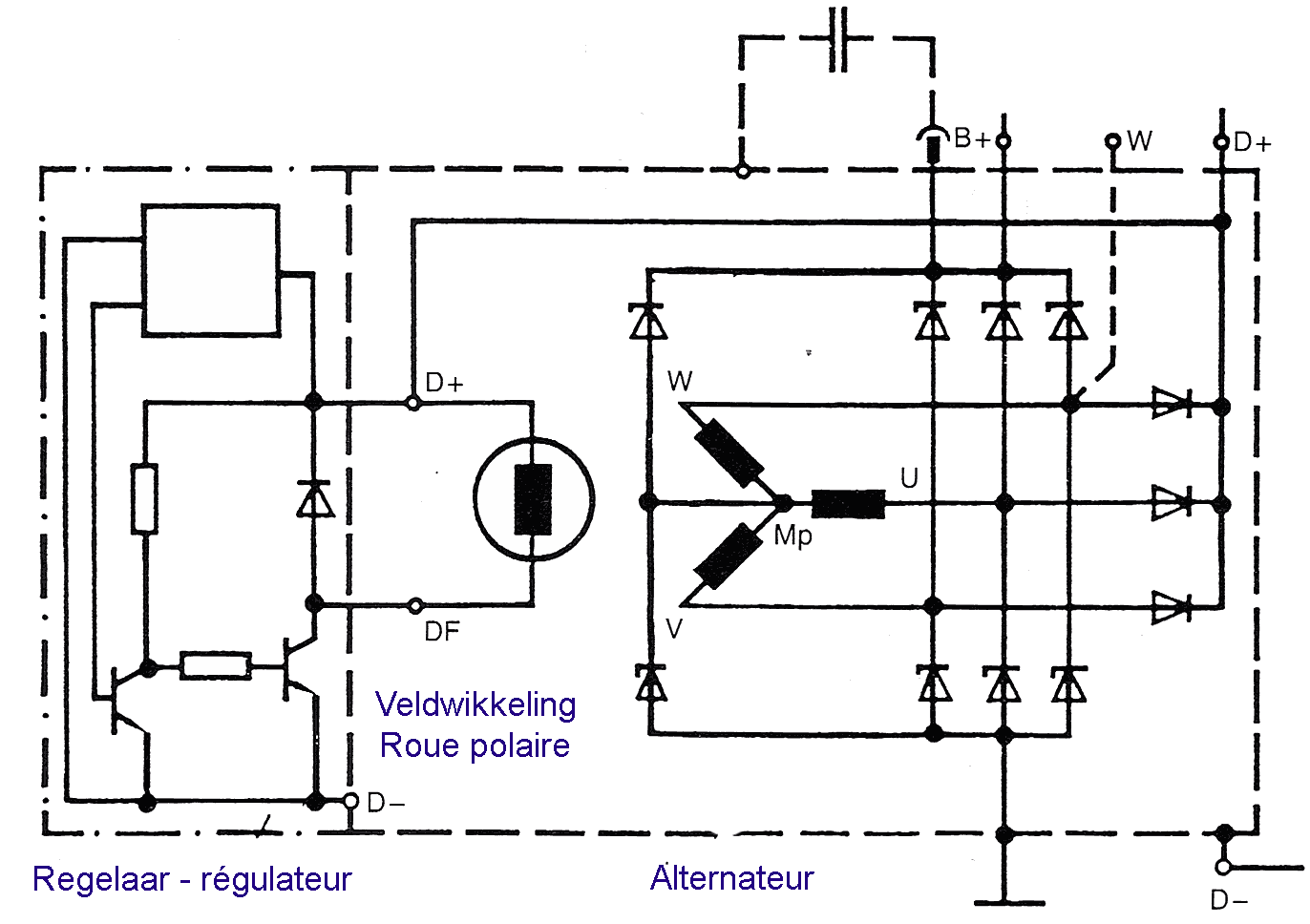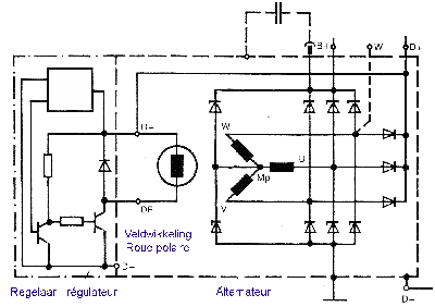 | De auto-alternator is een generator die gelijkspanning levert. De stabilisator en de gelijkrichter zitten ingebouwd in de alternator. Gelijkspanning is nodig om de batterij te kunnen opladen. |