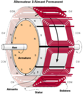 Dergelijke alternatoren hebben een compacte bouw en hebben een relatief grote diameter zodat er veel spoelen (polen) geplaatst kunnen worden. Deze alternatoren kunnen daardoor op een lagere snelheid draaien. De spoelen worden driefasig aangesloten om een constante belasting te vormen (een constante beslasting is enkel mogelijk met een driefasige uitgang). Het aantal spoelen moet daarom een veelvoud van 3 zijn (met een minimum van 6 spoelen). De spoelen worden op de polen gewikkeld die de stator vormen. De stator bestaat uit dunne metalen platen om een hoog magnetisch veld te hebben met weinig verliezen (vlakke spoelen). De permanente magneten worden op een armatuur gemonteerd bestaande uit gemakkelijk magnetiseerbaar weekijzer. De magneten moeten afwisselend een noord- en een zuidpool naar buiten hebben. Om een soepele werking te bekomen moeten er evenveel magneten zijn als er spoelen zijn. De spanning en de frekwentie is afhankelijk van de rotatiesnelheid. De spanning wordt gelijkgericht door een driefasige gelijkrichter en gebruikt om batterijen op te laden (zeer kleine installaties). In het algemeen wordt de gelijkgerichte spanning naar een omvormer gestuurd die wisselspanning maakt. Het vermogen wordt lokaal gebruikt (bufferbatterij noodzakelijk) of op het net gestoken.