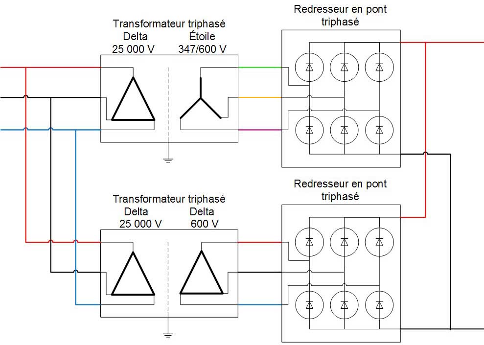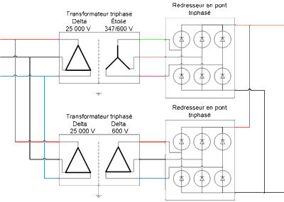 | Het zesfasig electriciteitsnet wordt meestal lokaal gebruikt om gelijkspanning te leveren aan grote verbruikers. |