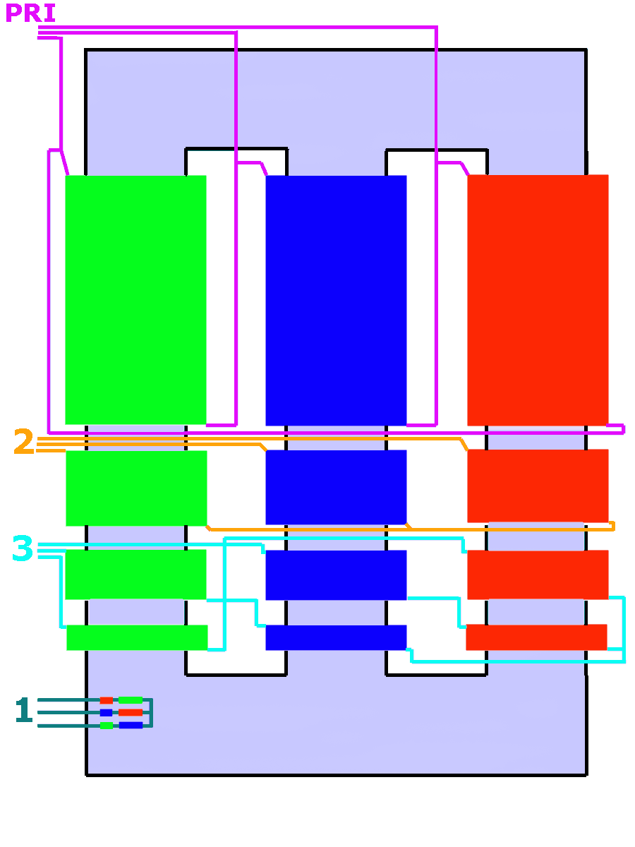 We hebben eerst de primaire wikkelingen ▄▄▄ die in driehoek geschakeld zijn, dan zijn de drie bovenste wikkelingen in de figuur rechts. Dan hebben we drie onafhankelijke uitgangen: