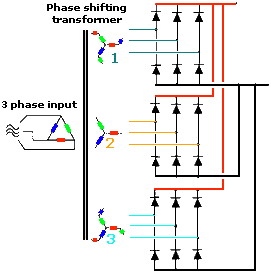 9-fasig netBij hexaphasé wordt de spanning met 12 diodes gelijkgericht (zie hierboven). Voor zeer hoge stromen wordt er gewerkt met transformatoren die twee tussenfasen geven in plaats van één. Het gelijkrichten gebeurt hier met 18 diodes (fasesprong = 20° in plaats van 30°). Een dergelijk systeem kan worden gebruikt als men wisselspanning wenst te gelijkrichten voor transport over lange afstanden (er zijn dan minder verliezen).De middenste transfo-uitgang (aangegeven als 2) heeft aan de secundaire kant een gewone sterschakeling. Men had ook een driehoekschakeling kunnen gebruiken, maar de overgang van ster naar driehoek of omgekeerd vangt beter de stoorpulsen op (harmonischen). De bovenste wikkelingen (aangegeven als 1) hebben
