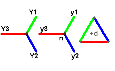 Transformator met tertiaire wikkelingIn enkele gevallen waar men geen open delta transformator wenst te gebruiken kan men kiezen voor een driefasige transformator met een extra tertiaire wikkeling die in driehoek geschakeld wordt. Deze wikkeling wordt gebruikt om de asymmetrie te compenseren en vaak wordt de wikkeling zelfs niet naar buiten gevoerd. De wikkeling is normaal berekend voor een vermogen gelijk aan 1/3 van het nominaal vermogen van de transfo.De tertiaire wikkeling wordt gebruikt in een Yyn of Yzn transformator als de belasting asymmetrisch kan zijn (de laatste transformator van de stroomverdeling). De aanduiding van de aansluiting is dan Yyn+d of Yzn+d. Uitleg over de aansluiting van transformatoren staat hier. Is de primaire wikkeling in driehoek geschakeld, dan is geen tertiaire wikkeling nodig, de funktie wordt dan overgenomen door de primaire wikkeling. De typische grootverbruiker die monofasig aangesloten wordt is de voedingspanning voor bepaalde treinen. In België en Nederland gebruikt men gelijkspanning, maar op de HST lijnen is dat 25kV wisselspanning monofasig. Gelijkspanning kan gemakkelijk bekomen worden met driefasige wisselspanning en belast het electriciteitsnet op een evenwichtige manier (zie lager), maar dat is niet het geval met de HST lijnen die monofasig gevoed moeten worden.