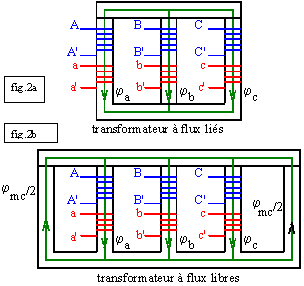 Monofasig of driefasigDe stroomverdeling gebeurt driefasig, de meeste transformatoren zijn dan ook driefasig, waardoor er minder ijzer en koper nodig is (met als gevolg minder veliezen). Het is enkel als de transformator zo groot zou moeten worden dat die niet vervoerd kan worden dat men drie monofasige transformatoren gebruikt (step-up transformatoren van electriciteitscentrales, dwarsregeltransformatoren,...).Als men drie monofasige transfo's gebruikt, dan kan men zich in een eerste fase beperken tot twee transfo's als het verbruik nog laag is, om later de derde transo bij te plaatsen. Dit is enkel mogelijk bij driehoekschakelingen. Gebruikt men monofasige transformatoren, dan kan men ook het systeen betrouwbaarder maken door een extra transformator te voorzien die dan in gebruik wordt genomen als een transformator onderhouden moet worden. De meeste transformatoren hebben drie kolommen met een primaire en secundaire wikkeling. Deze worden algemeen gebruikt, maar zijn minder aangeraden als de belasting asymmetrisch kan worden. Men gebruikt dan twee extra kolommen zodat de magnetische flux langs hier kan lopen "transformateur à flux libre"). Bij kleine sinstallaties geeft men vaak de voorkeur drie monofasige transformatoren te gebruiken in plaats van één driefasige transfo. Driefasige transfo's voor 1kVA en minder zijn zeer moeilijk te vinden. De transformator kan zowel in ster of driehoek aangesloten worden zoals motoren, maar bij transformatoren komt en nog een schakelwijze bij: de zig-zag aansluiting: zie schakeling van transformatoren.