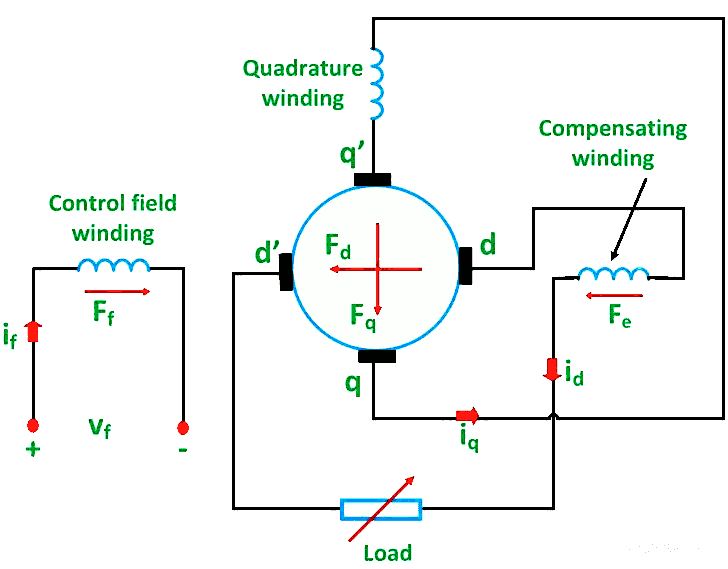 Amplidyne en metadyneRechts de voorstelling van een amplidyne (amplifying dynamo) met de controle-wikkeling, de koolborstels in kortsluiting om de ankerreaktie te versterken, de borstels om de spanning af te tappen en de compensatiewikkeling om het verschuiven van de polen ten gevolge van veranderingen in de uitgangsstroom te compenseren.Een amplidyne zonder compensatiewikkeling (GH) is een metadyne (compensatie = 0). Bij een metadyne zakt de spanning als de stroom toeneemt (hogere belasting). De benaming dwarsveldgenerator is van toepassing op zowel de metadyne als de amplidyne. De compensatie van de ankerreaktie maakt van een metadyne een amplidyne. Bij een amplidyne (compensatie = 1) is de uitgangsspanning evenredig met de bekrachtigingstroom, bij een metadyne (geen compensatie) is de uitgangsstroom evenredig met de bekrachtiging (de metadyne zet dus een ingangsspanning om in een uitgangsstroom). Bij een constante bekrachtiging blijft de spanning redelijk stabiel ongeacht de belasting (C = 1), terwijl bij een metadyne (C = 0) de stroom constant blijft. Een dergelijk systeem (met beperkte compensatie van 0.6) werd in treinen gebruikt die gevoed werden met gelijkspanning (600V) om de motoren op de wielen aan te drijven. De metadyne had een hoger rendement en gaf een meer gelijkmatige versnelling dan een systeem met rheostaten. De metadyne werkt immers als transformator (aanpassing van de ingangsspanning aan de gevraagde uitgangspanning), niet als weerstand die vermogen dissipeert. Bij een metadyne met beperkte compensatie is het vermogen evenredig met de veldstroom. Bij overcompensatie heeft de generator zelfs een negatieve inwendige weerstand (de spanning stijgt als er meer stroom afgenomen wordt). De werking van de generator is dan niet meer te controleren.