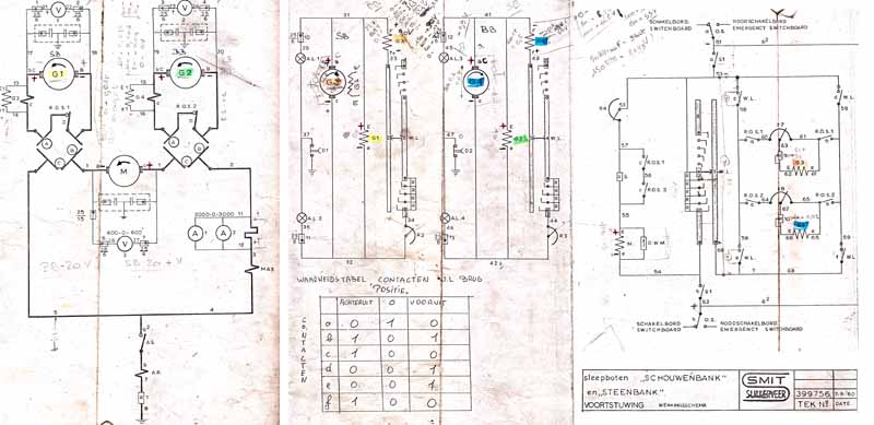 Bekrachtiging 1De schakeling wordt van rechts naar links gelezen.De boordvoeding is 220V gelijkspanning, dit was toen de norm. Men gebruikte eerder dynamo's dan alternatoren. De sleper bezit ook een batterijbank zodat er stroom geleverd kan worden als de stroomgroep niet draait. De bekrachtigingsstroom (veldstroom) voor de bekrachtigingsdynamos en voor de motor wordt afgenomen van het boordnet. Dit zijn de veldwikkelingen G3 E-e, G4 E-e en M E-e. De bekrachtigingsstroom voor de dynamos is instelbaar bij het maneuvreren (lage snelheden). Bij hogere snelheden wordt de bekrachtigingsstroom op een maximale waarde gehouden (alle schakelweerstanden kortgesloten). De draaizin van de motor wordt hier ingesteld door het veld van de bekrachtigingsdynamo via de boordvoeding om te polen. De bekrachtigingsdynamo levert zo een positieve of negatieve spanning. Er zijn drie rheostaten om de bekrachtigingsstroom nauwkeurig bij te stellen (gelijkloop). Deze instelling wordt niet meer gewijzigd tijdens de vaart.