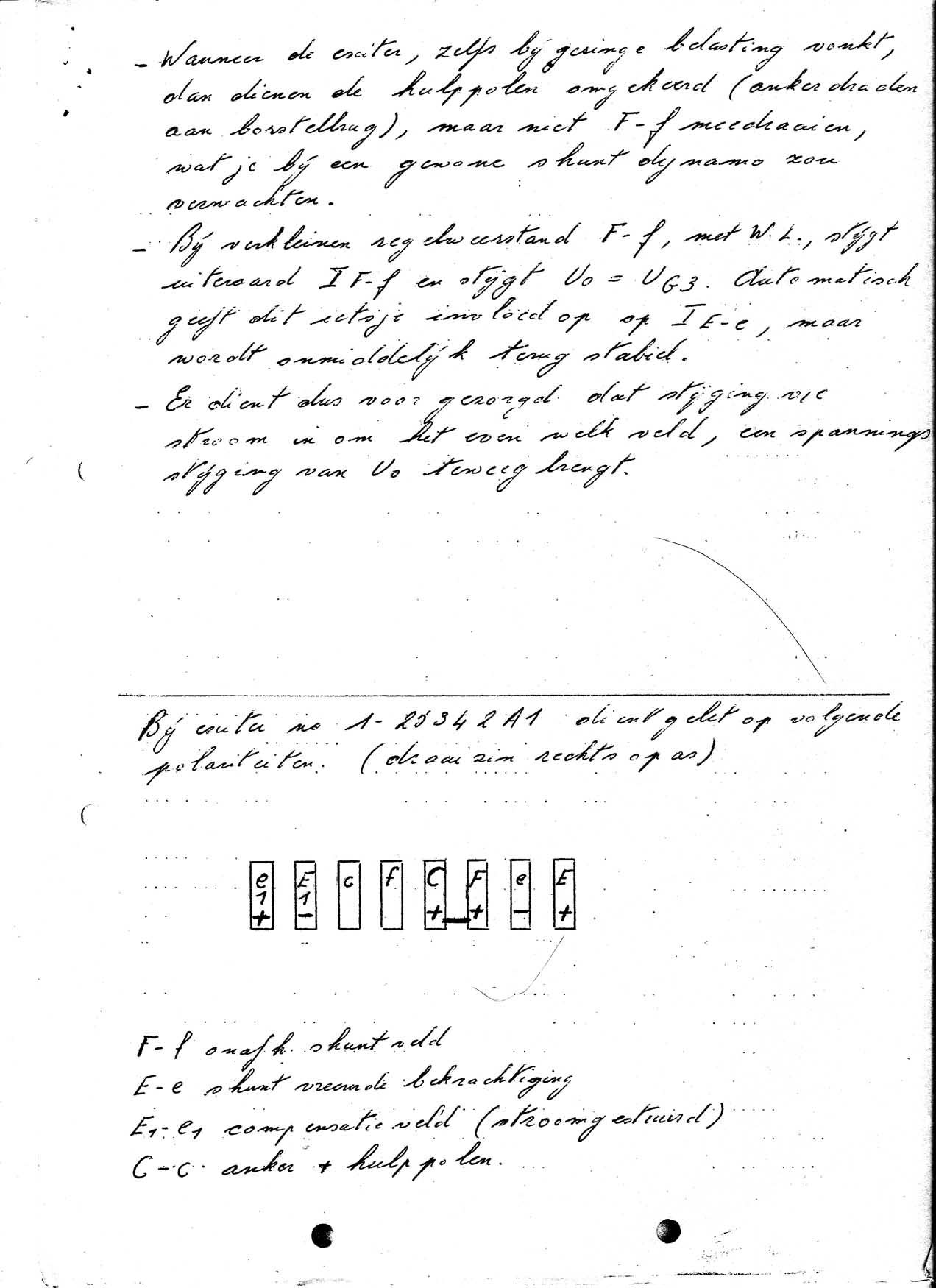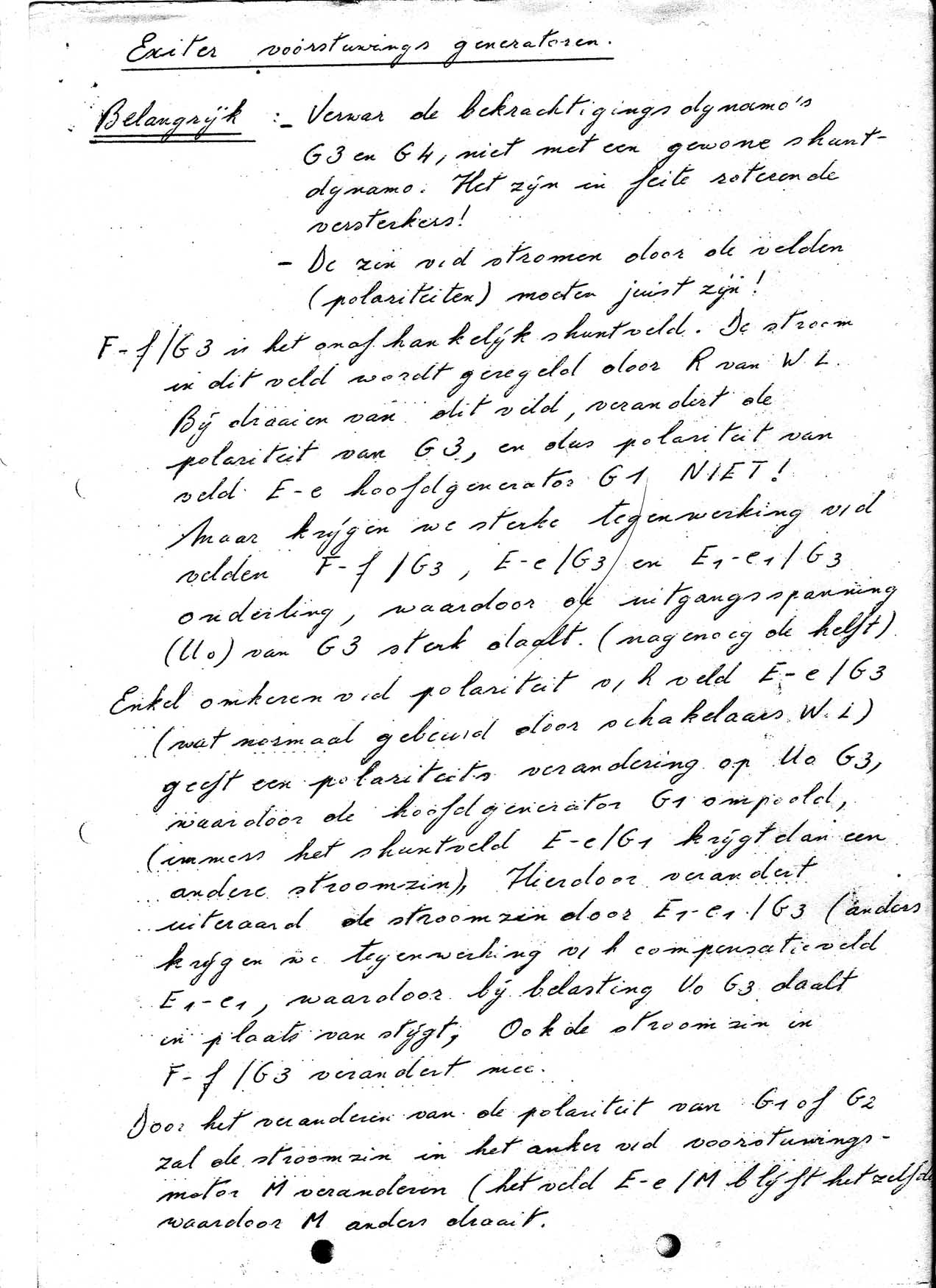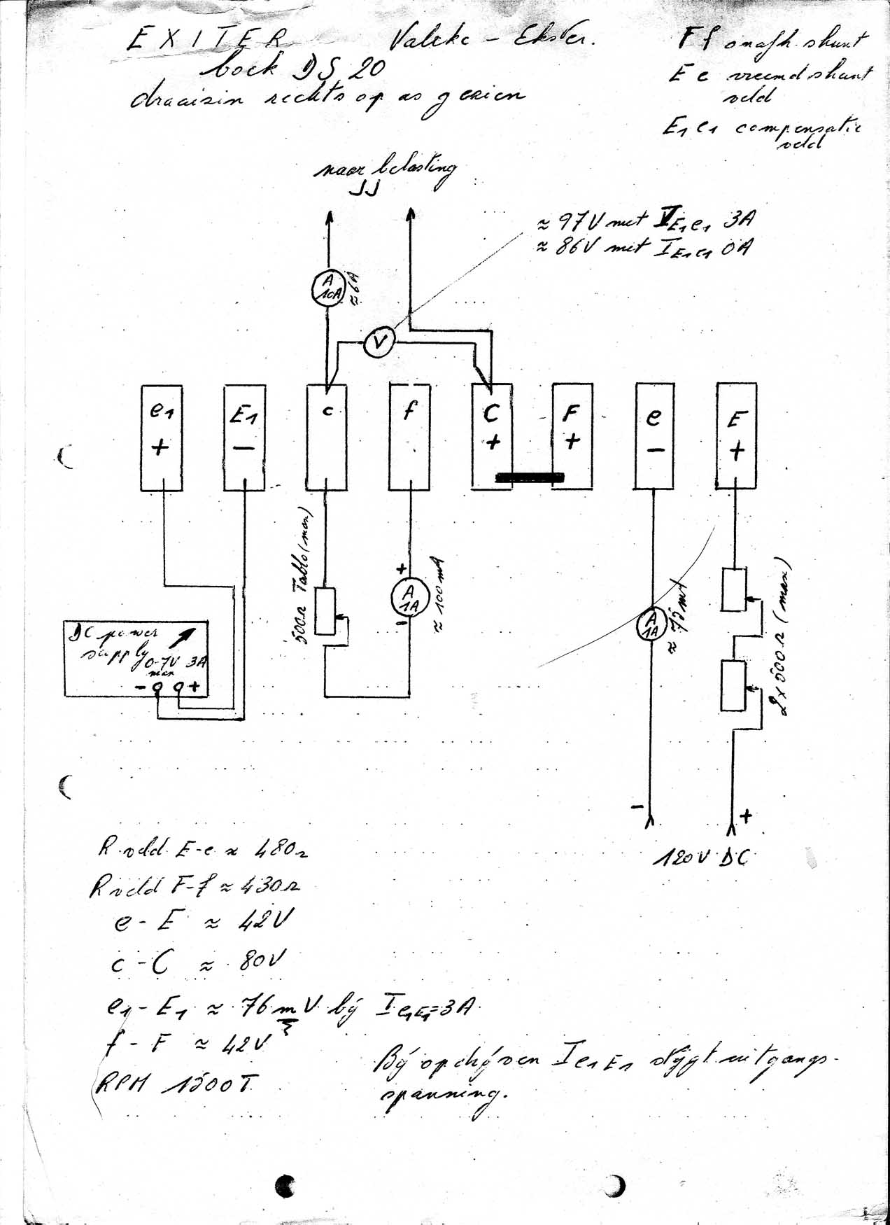 Bekrachtiging 2Centrale gedeelte van het schema.De bekrachtigingsdynamo's (opwekkers) leveren voornamelijk de veldstroom voor de vermogensdynamo's (hoofdgeneratoren). Bij normale vaart wordt de veld van de bekrachtigingsdynamos ingesteld via een shuntwikkeling die min of meer stroom ontvangt. Bij lage vaartsnelheden wordt de maximale weerstand ingesteld (alle schakelweerstanden in gebruik) en wordt het vermogen ingesteld door de bekrachtiging 1.