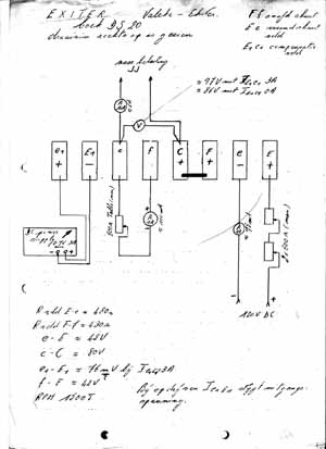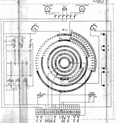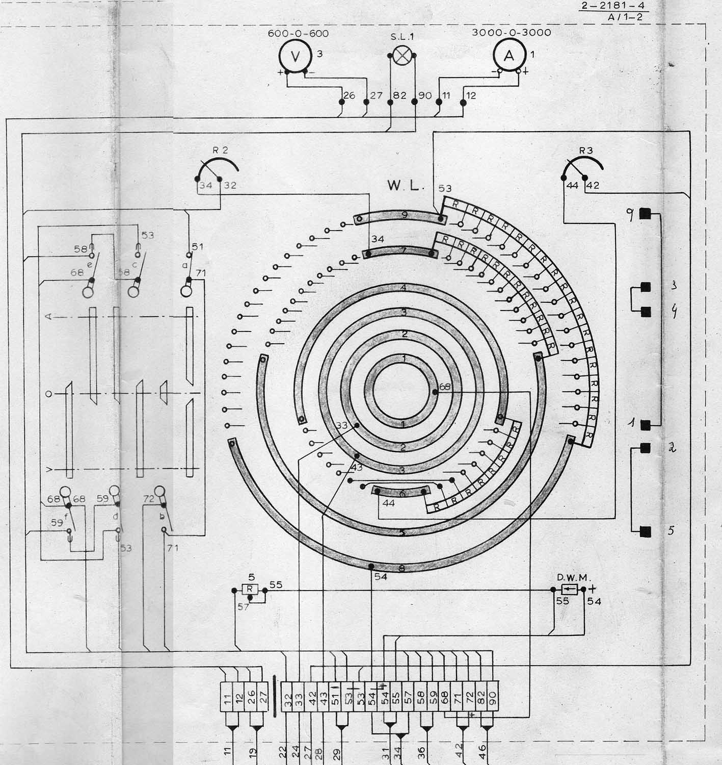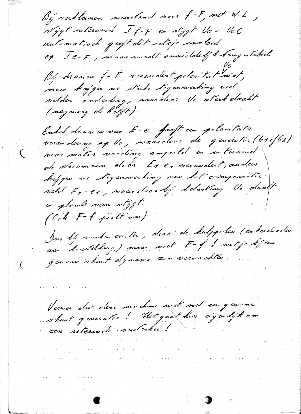 Bekrachtiging 2Centrale gedeelte van het schema.De bekrachtigingsdynamo's (opwekkers) leveren voornamelijk de veldstroom voor de vermogensdynamo's (hoofdgeneratoren). Bij normale vaart wordt de veld van de bekrachtigingsdynamos ingesteld via een shuntwikkeling die min of meer stroom ontvangt. Bij lage vaartsnelheden wordt de maximale weerstand ingesteld (alle schakelweerstanden in gebruik) en wordt het vermogen ingesteld door de bekrachtiging 1.
