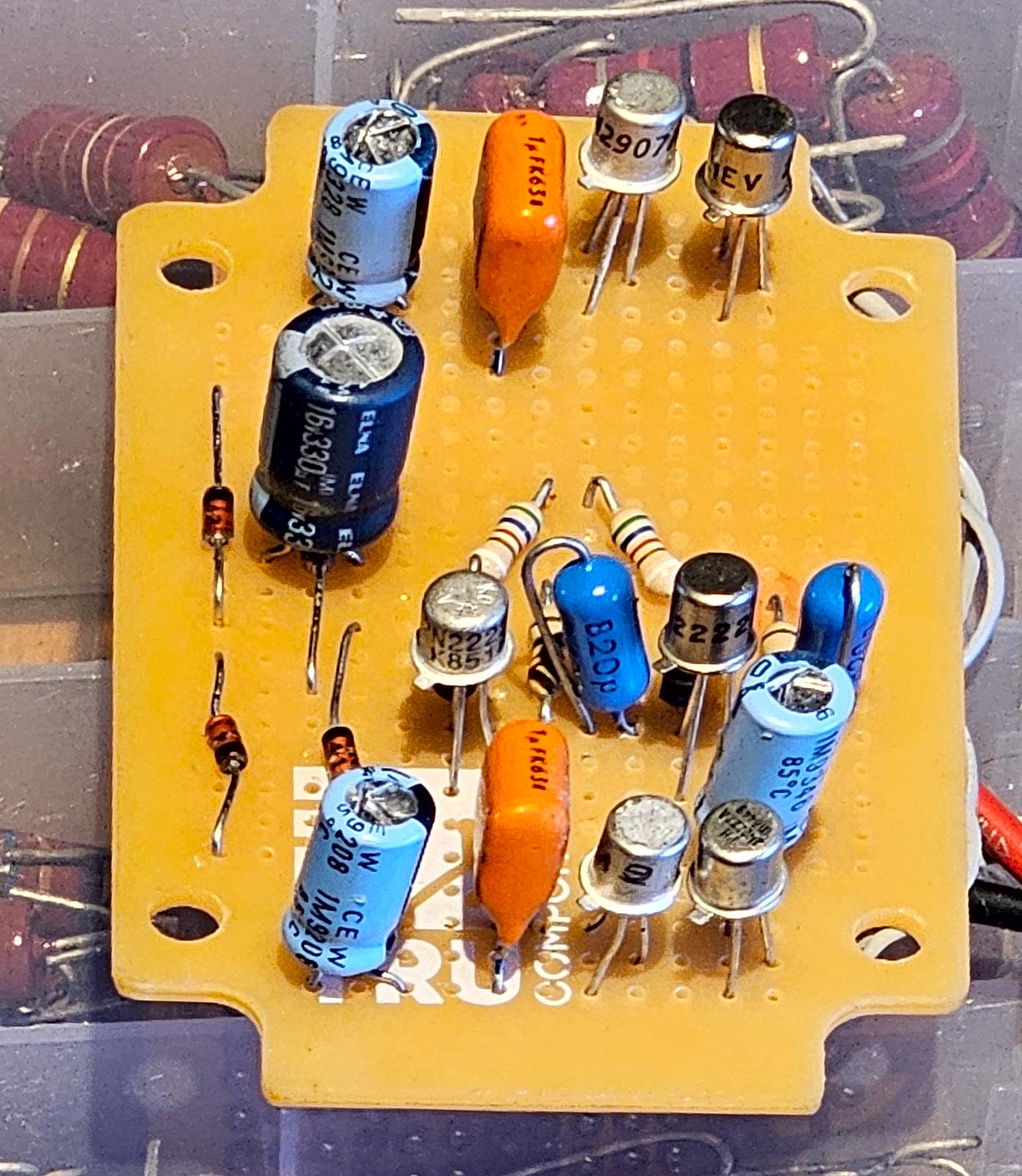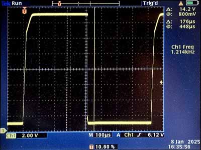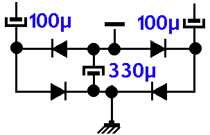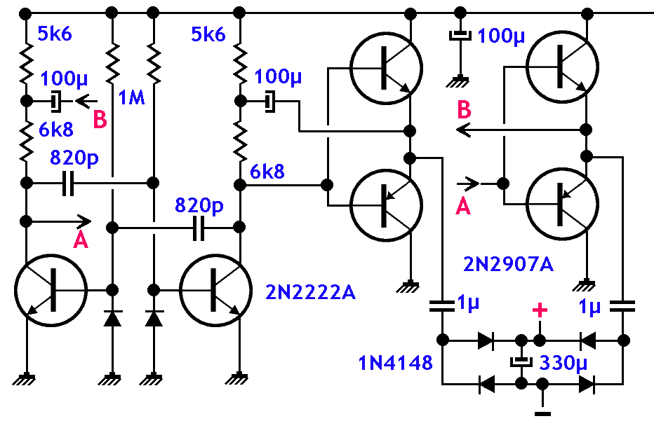 Maar je hoeft niet noodzakelijk een transfo te gebruiken. Voor kleine vermogens kan dit zonder transfo, maar met twee condensatoren. De bedoeling hier was 9V 5mA te leveren aan een display die een gescheiden voeding nodig had (eerste afbeelding rechts) De schakeling is complexer geworden dan wat ik dacht, maar is geëvolueerd uit een simpele multivibrator. Overigens kan je hetzelfde bereiken met een CD4096 (hex invertor), maar ik had er geen bij de hand (echte IC's in DIL uitvoering worden moeilijk te verkrijgen). De schakeling is complexer geworden dan wat ik oorspronkelijk voor ogen had, en misschien had ik toch beter gewacht op die bestelling van conrad.be... We hebben eerst een traditionele astabiele multivibrator. De twee diodes dienen om de transistoren op lange termijn te beschermen: NPN transistoren houden niet van te negatieve pulsen op hun basis en met een voedingspanning van 14 à 15V zijn dat spanningspieken die de emitter-basis overgang in geleiding brengen (de basis-emitter overgang is een zenerdiode die niet als zenerdiode wilt werken). Op termijn kunnen die spanningspieken de transistor beschadigen. Hetzelfde is natuurlijk ook geldig voor PNP transistoren (positieve pulsen). Met condensatoren van 820pF bedraagt de frekwentie 1.2kHz. De frekwentie hangt af van de voedingspanning, maar door de extra trap niet van de belasting. De multivibrator heeft ook een dubbele bootstrap (dat zijn de twee elko's van 100µF). Ze veranderen niet de werking van de multivibrator maar zorgen ervoor dat de uitgang van de multivibrator de volledige swing kan doen. Je ziet een dergelijke bootstrap soms in audioversterkers die met discrete componenten zijn gebouwd. De uitleg is eenvoudig en wordt gegeven aan de hand van de tweede transistor. Geen probleem als de transistor in geleiding is: de collectorspanning is nagenoeg 0V. Als die uit geleiding gaat wordt de spanning op de collector positief, maar gaat niet tot aan de voedingspanning omdat er stroom geleverd moet worden aan de derde en vierde transistor (totempaal). De spanning stijgt wel, maar niet tot de voedingspanning, zeker als de totempaal stroom moet leveren. Door de condensator van 100µF wordt de spanningstijging op de uitgang van de totempaal terug gebracht naar de multivibrator zodat de spanning op die plaats kan stijgen tot boven de voedingspanning. Onbelast heeft de bootstrap geen nut, maar zijn effect stijgt met een stijgende belasting. De skoop geeft het beeld op punt B: we zien dat de spanning keurig van 0.6V naar 14.4V gaat (de voedingsspanning bedraagt hier 15V). De 0.6V die we aan beide kanten verliezen is de emitter-basis spanning in de totempole. De totempaal is toegepast in de vorm die we kennen bij audio versterkers. Er is hier geen voorpolarisatie nodig om de overnamevervorming te beperken, want dat is niet nodig: de uitgang schakelt continu van positief naar negatief. De totempool dient om de zeer lage stroom die de multivibrator kan leveren te verhogen. De galvanische scheiding wordt hier bereikt door de condensatoren. Ik gebruik hier geen elko's omdat ik niet weet of de spanning positief of negatief kan worden. De stroom die de omvormer kan leveren is voornamelijk beperkt door de condensatoren (hier hebben we eigenlijk te maken met een condensator van 0.5µF). De omvormer kan een stroom van 5mA leveren bij een spanning van 10V. Ik gebruik hier bewust condensatoren van lage waarde, zodat die als verliesvrije weerstand kunnen dienen (264Ω in totaal), maar ook om common mode storingen te onderdrukken. Als het toestel dat gevoed moet worden een galvanische scheiding nodig heeft, dan kunnen storingen de werking van het toestel storen. Het rendement van de schakeling is zeer hoog: het eigenverbruik van de schakeling bedraagt 1.1mA en stijgt niet met de belasting. Andere schakelingen die een dubbele op-amp gebruiken als multivibrator hebben een eigenverbruik van ongeveer 3mA en door het ontbreken van een bootstrap is de uitgangspanning lager. Met deze schakeling kan je ook een negatieve spanning maken: de wijziging staat hierboven. Het enig verschil is dat de positieve uitgang met de massa is verbonden, waardoor de uitgangspanning negatief wordt. Omdat men hier geen rekening moet houden met common mode storingen is de waarde van de koppelcondensatoren verhoogd tot 100µF. Deze schakeling is echter niet meer kortsluitvast.