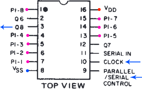 Opslag in een statische CMOSOm waarden op te slaan gedurende een stroomonderbreking kan men een CMOS IC gebruiken. Ik heb daarvoor de CD4021 gekozen, die 8 parallele ingangen en een seriële uitgang heeft. Het IC heeft ook een seriële ingang die hier niet gebruikt wordt. Men mag zoveel schrijfoperaties uitvoeren, het IC zal daardoor niet verslijten, des te meer dat we hem op een lage spanning van 5V laten werken.