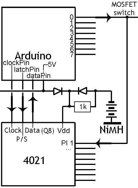 Om de toestand van de digitale lijnen te bewaren tijdens een stroomonderbreking moet de CMOS natuurlijk gevoed worden door een kleine accu. De minimale spanning bedraagt 3V, waardoor 3 NiMH elementen van 1.2V gebruikt kunnen worden. Het verbruik van het IC is minder dan 100µA zodat een accu van 3.6V 100mA voldoende is voor een maand. Met een weerstand van 1kΩ is de laadstroom 1.5mA bij een lege accu en 300µA bij een volle accu. De diodes zijn laagvermogen schottky's. Als de stroom terugkeert volstaat het de gegevens sekwentieel terug in te lezen en de uitgangen van de arduino te sturen. Dit gebeurt in de setup. Er bestaat een instructie om alle bits in één keer te lezen: