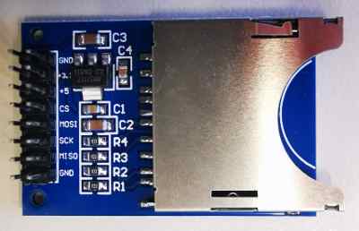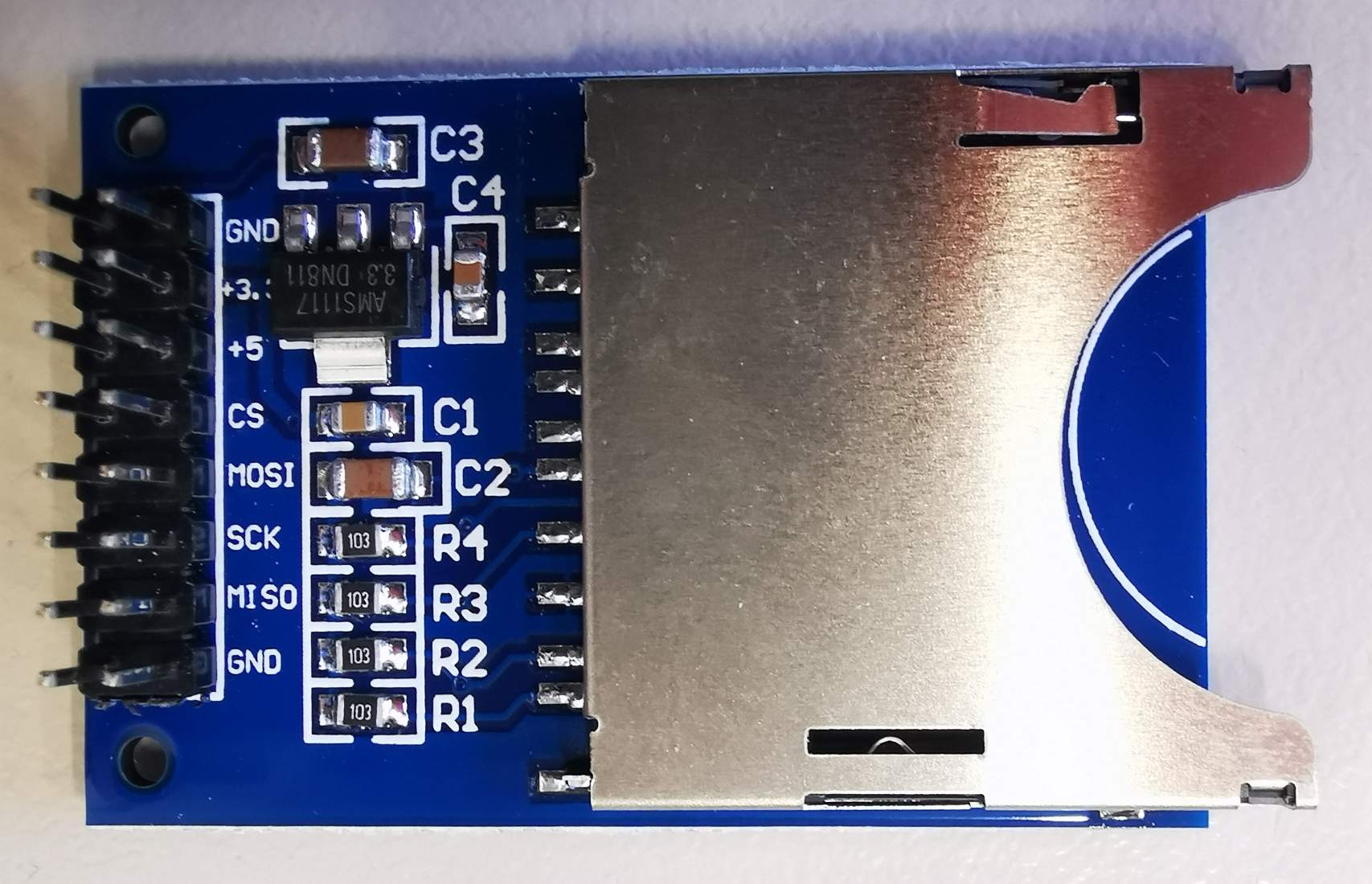 Het protocol wordt nog volop gebruikt door bijvoorbeeld beeldschermen, real time clocks, geheugenchips (EEPROM), intelligente sensoren en dergelijke meer. SPIDit is een recenter en sneller protocol die met unidirectionele lijnen werkt om één van de beperkingen van I2C te omzeilen. Het is mogelijk data over langere afstanden te versturen door middel van lijnversterkers, maar in de praktijk worden de gegevens slechts over een paar meters verstuurd. Er zijn 4 communicatielijnen nodig.De norm wordt gebruikt door bepaalde apparaten zoals SD geheugenkaarten. Een SD interfacekaart bevat niet veel meer dan een kaarthouder en een connector. Om het protocol te kunnen gebruiken moet de library SPI gebruikt worden. De digitale lijnen 11, 12 en 13 worden hiervoor gebruikt, samen met lijn 4 voor de chipselectie. Om een geheugenkaart te lezen moet men ook de library SD gebruiken. Deze bevat de nodige routines om met de datakaart te werken (FAT-16 of FAT-32 geformateerd). Een voorbeeld waar gegevens op de geheugenkaart geschreven worden staat uitgelegd op de pagina opslaan van gegevens op een datakaart (opmaken van logs). Een voorbeeld van een SD kaarthouder staat rechts, je ziet de 4 communicatielijnen: Chip Select, Master Out Slave In, Serial Clock en Master In Slave Out en de voedingslijnen. De kaarthouder bevat enkel een 3.3V voeding voor kaarten die enkel op 3.3V werken. CANDe CAN bus is een seriële databus. Bij een bussysteem worden er meer apparaten op eenzelfde lijn aangesloten. Een van de kenmerken van de CAN bus is dat deze met prioriteiten werkt: een apparaat met een lagere prioriteit stopt met zenden als er een apparaat met een hogere prioriteit zendt.De apparaten hebben geen echte adressen: een adres is in feite een pririteitslevel. Alle apparaten op de bus kunnen de data lezen en daarop reageren indien nodig (softwarebepaald in het apparaat). De bus werd oorspronkelijk gebruikt in auto's om het aantal kabels te beperken, maar het protocol wordt veelvuldig in de industrie gebruikt. De busspanningen zijn niet compatibel met de spanningen die door een arduino (of een andere microcontroller) gebruikt worden. Een specifieke IC MCP2515 voert de vertaling uit tussen SPI (locale communicatie tussen bijvoorbeeld een processor en de busdriver) en CANbus (communicatie tussen verschillende apparaten. Het apparaat hier is een deel van het motormanagement. Het stuurt de informatie betreffende de ingangen door naar de bus en zet de uitgangen hoog of laag naargelang de ontvangen data.