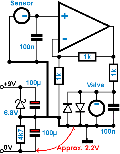 De sensor levert een negatieve spanning ten opzichte van de aarde (het chassis van de boiler). Een klein hulpcircuit zorgt voor een nulpunt die ongeveer halverwege het spanningsbereik van de 9V-batterij ligt (de aanwezigheid van de zenerdiode wordt later uitgelegd). Een kleine condensator van 100nF filtert de sensorspanning (om spanningspieken te elimineren die door de piëzo-ontsteking worden gegenereerd), en het signaal gaat rechtstreeks naar de op-amp. De versterkingsfactor van de versterker is ingesteld op 2x. De gasklep wordt beschermd tegen spanningspieken door twee 1N4148 diodes en een condensator van 100nF; ik weet de maximale spanning van de spoel van de gasklep niet. Aangezien de sensor een negatieve spanning produceert, neem ik aan dat de gasklep ook een negatieve spanning nodig heeft om correct te functioneren. De spanning aan de uitgang van de op-amp is negatief ten opzichte van de aarde, en om te voorkomen dat de aardpotentiaal te veel fluctueert, heb ik een zenerdiode in de positieve tak gebruikt. De stroom vloeit van de minpool naar de op-amp, vervolgens naar de sensor, dan naar de aarde en via de zenerdiode terug naar de positieve pool. De zenerdiode stabiliseert de spanning, zelfs als de stroom enigszins varieert. Het stroomverbruik is zeer laag; ik moet de 9V-batterij slechts één keer per maand opladen. Om de schakeling te testen heb in en spanningsdeler van 1000× aan de ingang gebruikt (weerstand van 120kΩ en 120Ω). Als de weerstand op de plus van de accu verbonden wordt heb ik ene spanning van 13.5mV op de uitgang, verbonden met de min heb ik -4.5mV: de schakeling werkt perfect! Als je ook je waterverwarmer wilt repareren, maar de sensor een positieve spanning levert, moet je alleen de componenten om de aardpotentiaal vast te leggen van plaats verwisselen (3,9V zenerdiode en 6,8kΩ weerstand).