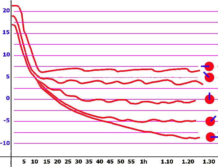 Rechts een ander temperatuurverloop, koelkast gevuld met een waterfles van 1 liter, buitentemperatuur +24.8°, thermostaat op maximum. Het verloop is trager omdat er water in de koelruimte zit. Na de test was het water bevroren, maar van zodra de motor uitgeschakeld werd begon het water te ontdooien: een teken dat het water nauwelijks onder de 0° zat. Het is duidelijk dat de koelkast de lucht koelt, die dan op zijn beurt het water koelt.
