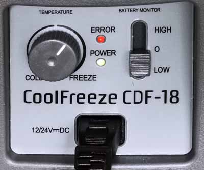 ![]() Een temperatuur lager dan -13° is moeilijk te bereiken. De thermostaat is electronisch en stuurt indirect de koelkastmotor. Er staat geen temperatuursindicatie op de thermostaat, daarom gebruik ik een windroos om de stand aan te geven. Op zuid-west heb je een minimale koeling en op zuid-oost is de koeling maximaal. Zelfs met de compressor uitgeschakeld is er een permanent verbruik van 30mA (ook met de schakelaar in uit-stand), daarmee moet je rekening houden als je de frigo enkele weken achterlaat. De bediening is minimaal, te vergelijken met die van een normale tafelkoelkast: een thermostaat en een drie-standenschakelaar: stop, werking op startbatterij (high) of deep cycle batterij (low).