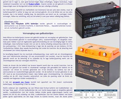 LiFePO4 (lithium-ijzer-fosfaat)De meest moderne technologie is de LFP accu. Deze accus hebben de vorm van een loodbatterij, maar betere eigenschappen. Er is een ingebouwde bescherming zodat de cellen niet te leeg getrokken worden. De cellen worden ook beschermd tegen overladen, maar dit betekent dat de batterij losgekoppeld wordt van de installatie, waardoor de spanning kan oplopen, tot meer dan 20V naargelang het paneel. Er is hier een electronische bescherming nodig tegen overspanningen.