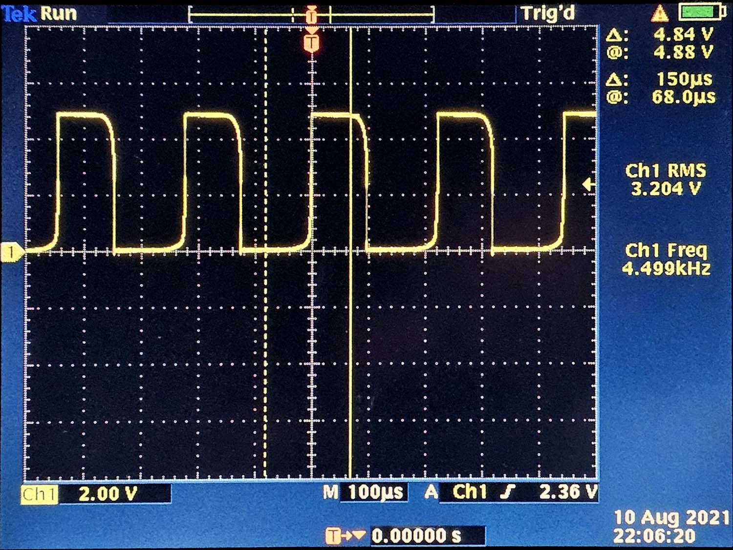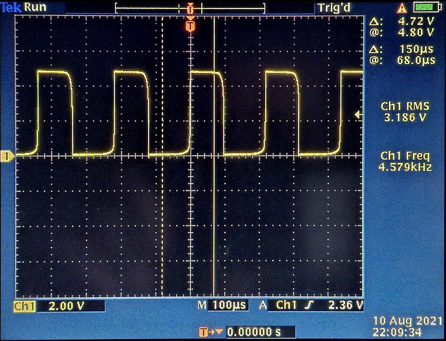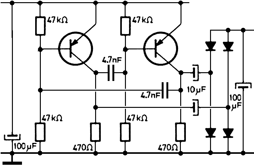 La fréquence de l'oscillateur est d'environ 4.5kHz. On voit que le sweep va de 4.84V à 4.72V (4.7k à 1.8k), un signe que la puce peut fournir le courant nécessaire sans problème. La puce est de type 54HC qui peur fournir et absorber 4mA par sortie, et j'en utilise 3 en parallèle. Une autre possibilité c'est de tout simplement utiliser un multivibrateur avec deux transistors standard (BC178, BC558, 2N2907 ou équivalents). La consommation est d'environ 5mA. On peut aussi utiliser des transistors NPN (BC108, BC548, 2N2222,...) si on adapte le schéma. ![]() |