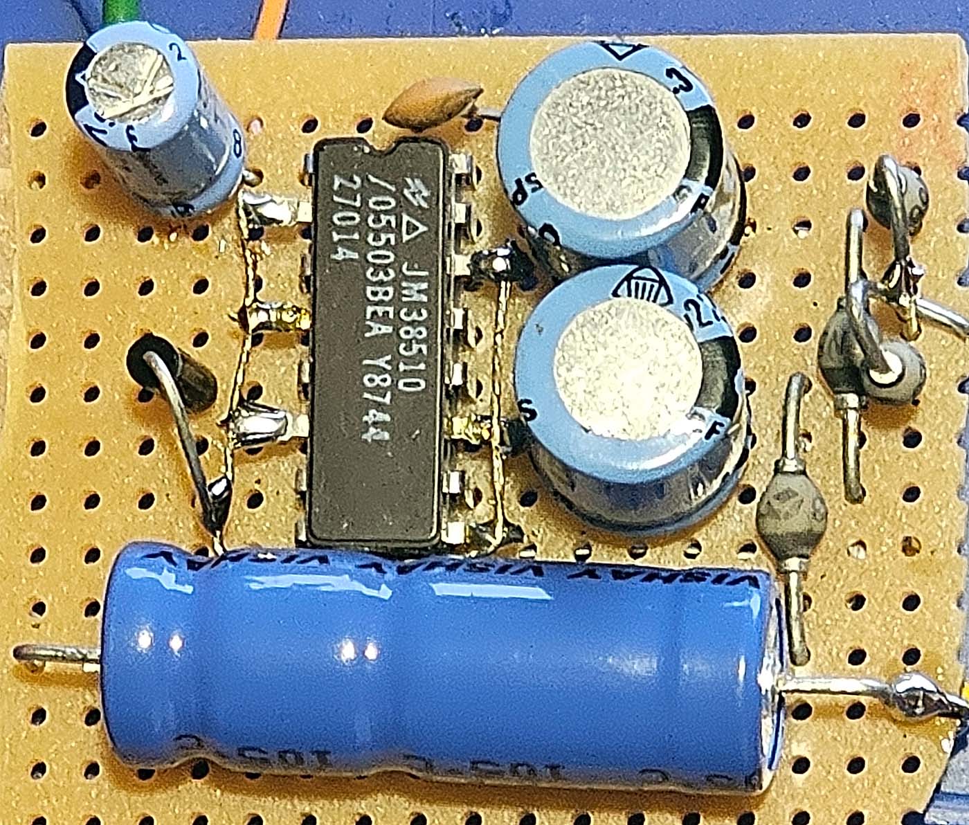 On peut utiliser un CD4096, mais je n'en avait pas en stock et j'ai du me rabattre sur un JM38510/05503BE, qui est comparable au SN54HC14. C'est la version militaire de la série 74. Il s'agit d'un circuit CMOS qui travaille avec des niveaux TTL. Les circuits TTL ne fonctionnenet qu'avec 5V, mais cela ne cause pas de problème ici, puisque nous n'avons que du 5V. Attentions, les différentes technologies ont des brochages différents. Sur le photo on voit deux des pontages (le troisième se trouve en dessous de la puce). Le montage ci-dessus (photo) utilise un électrochimique de 150µF (alimentation +5V), deux électrochimiques de 220µF pour la pompe et un électrochimique de 1000µF en sortie. On peut augmenter la valeurs des électrochimiques jusqu'à 220µF ou plus sur le schéma en haut de page.