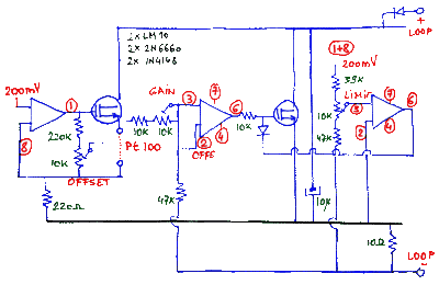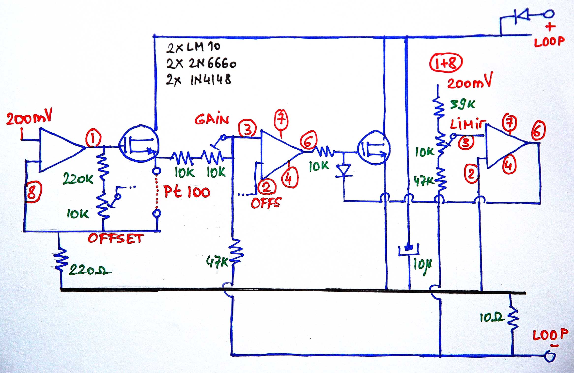 Hieronder een Pt-100 naar 4-20mA current loop zoals in de industrie gebruikt. Men ziet de transistor die als programeerbare stroombron gebruikt wordt en de LM10 als op amp. De gebruikte schakeling komt redelijk goed overeen met mijn ontwerp.